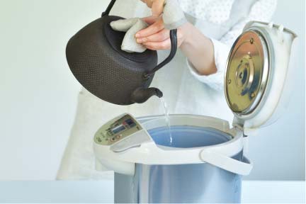 Then throw away the hot water. Repeat this 2-3 times. *Please be careful not to empty the fire.